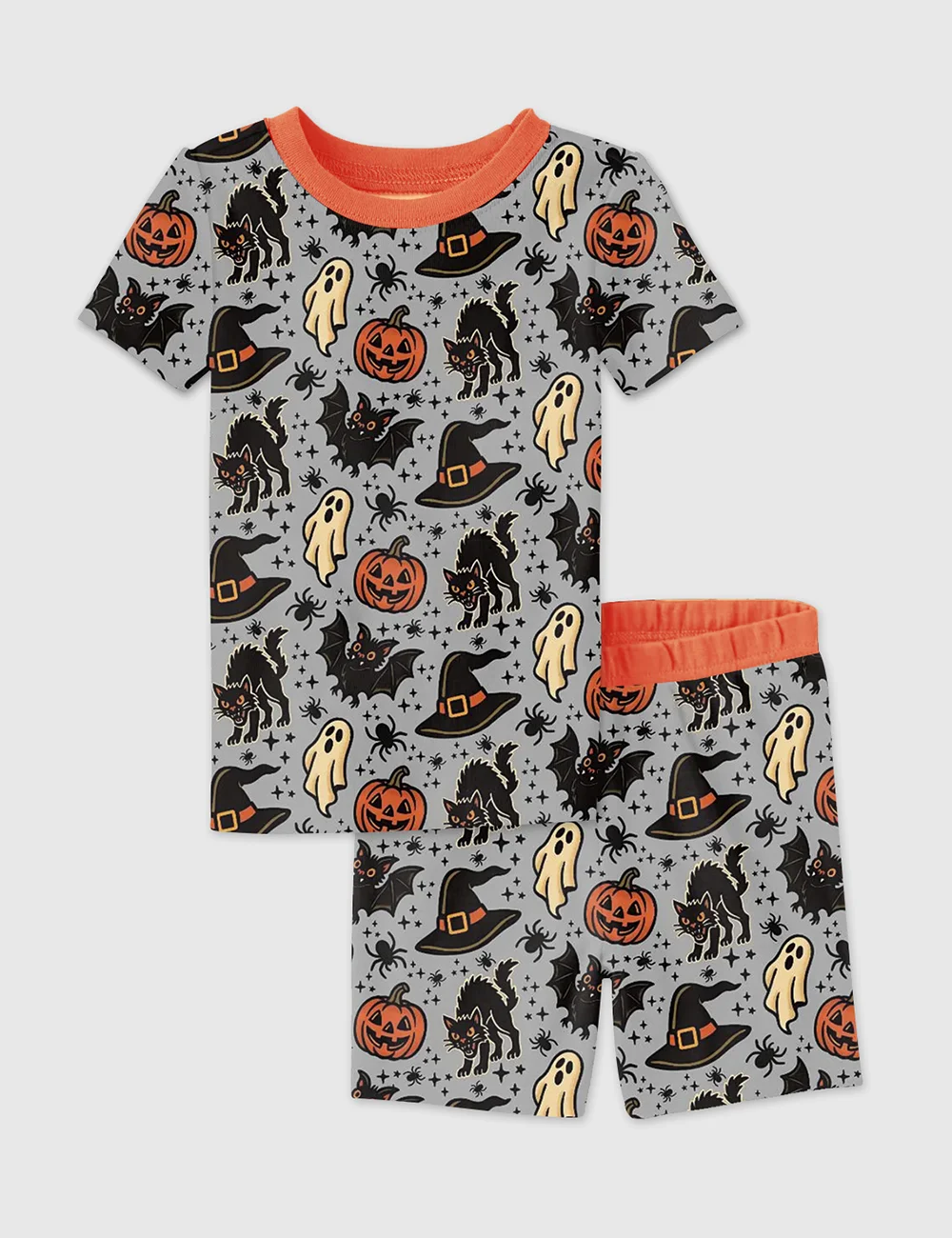 Kid's Halloween Spooky Ghosts Bats Cats Pumpkins Witch Short Sleeve Pajama Set