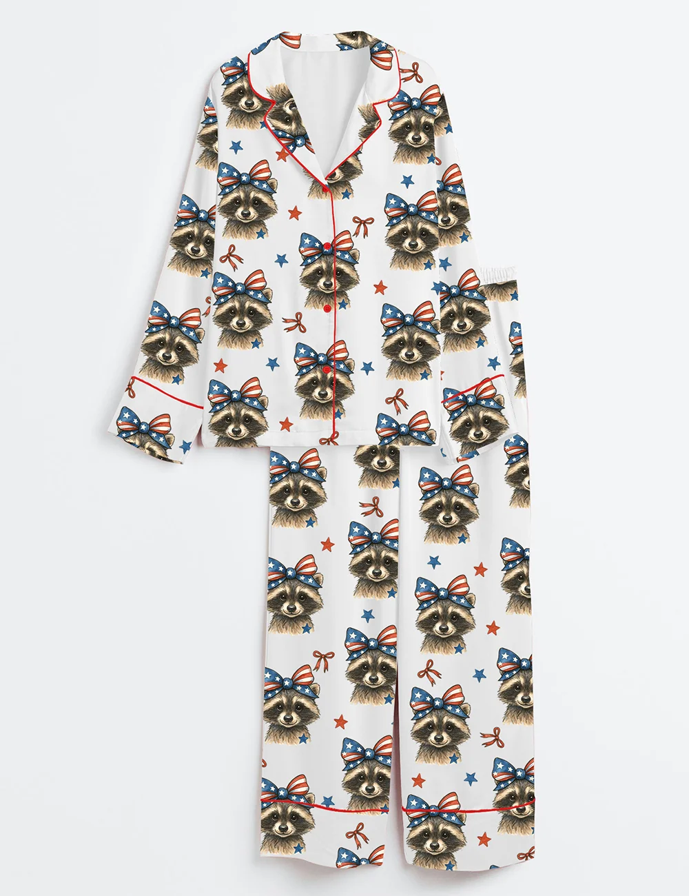 Women’s 4th Of July America Funny Cute Baby Highland Cow Print Long Sleeve Satin Pajama Set