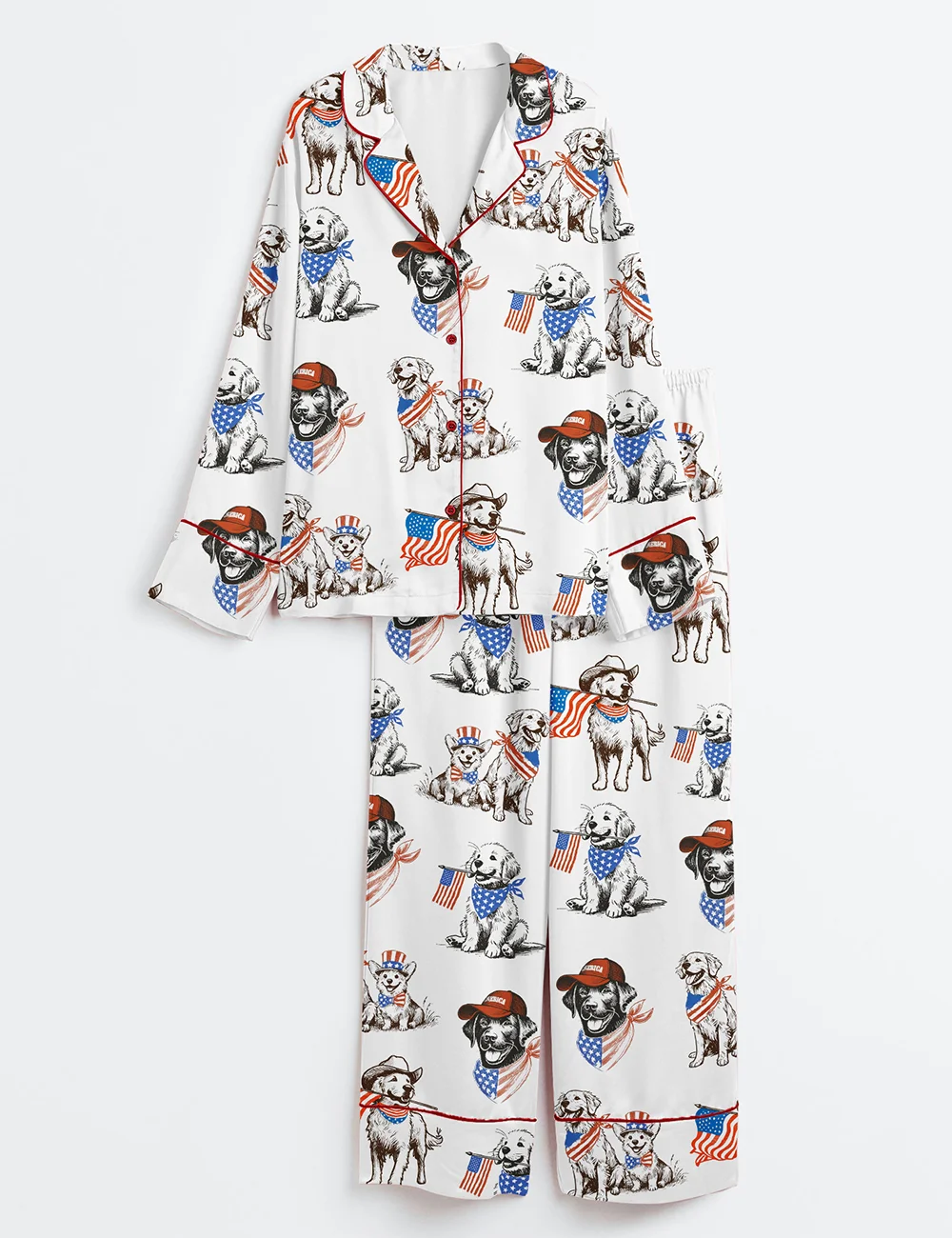 Women’s American Pride Pooch Western Patriotic Dog 4th Of July Print Long Sleeve Satin Pajama Set