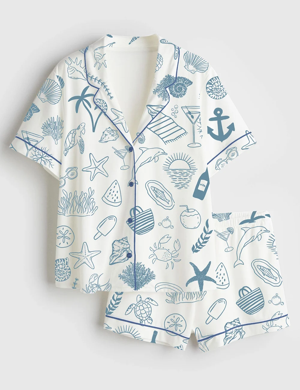 Women’s Coastal Beach Ocean Shark Summer Nautical Short Sleeve Satin Pajama Set