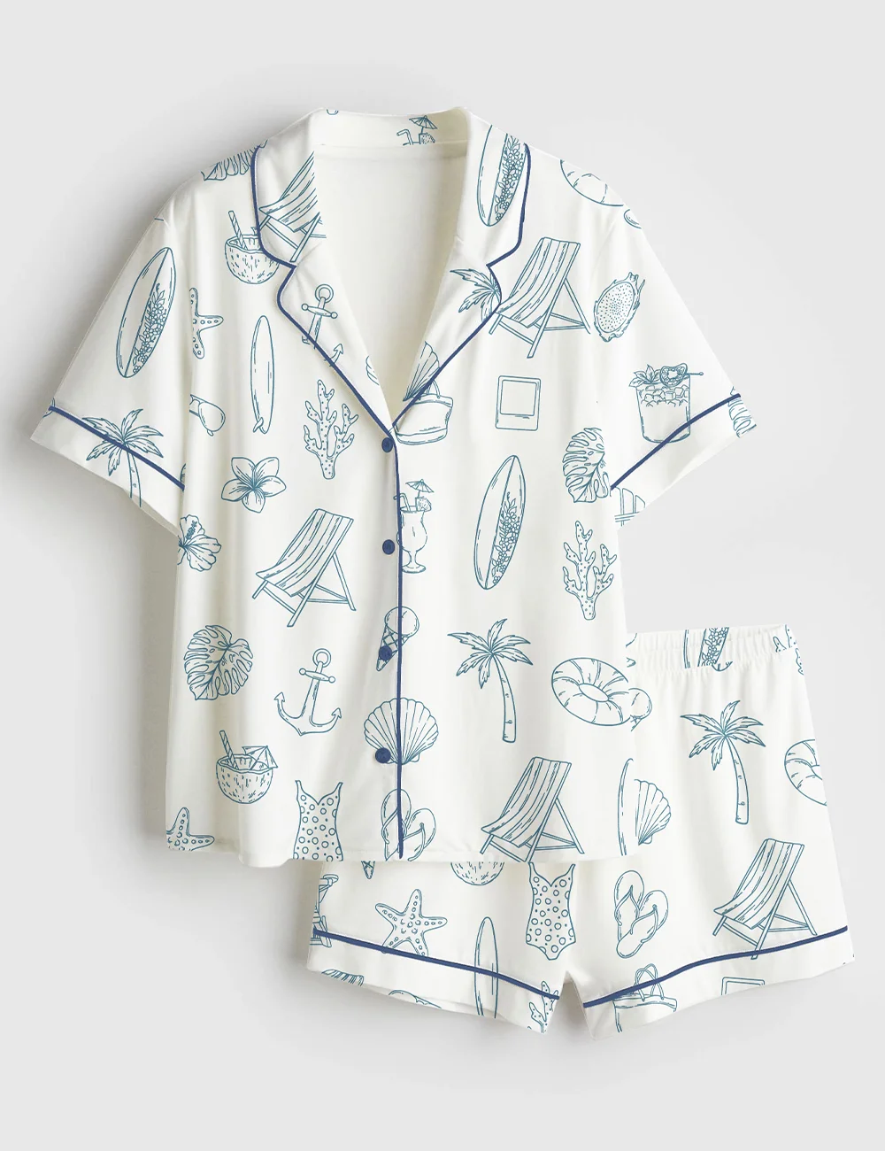Women’s Coastal Summer Hand Drawn Nautical Beach Seaside Vacation Print Short Sleeve Satin Pajama Set