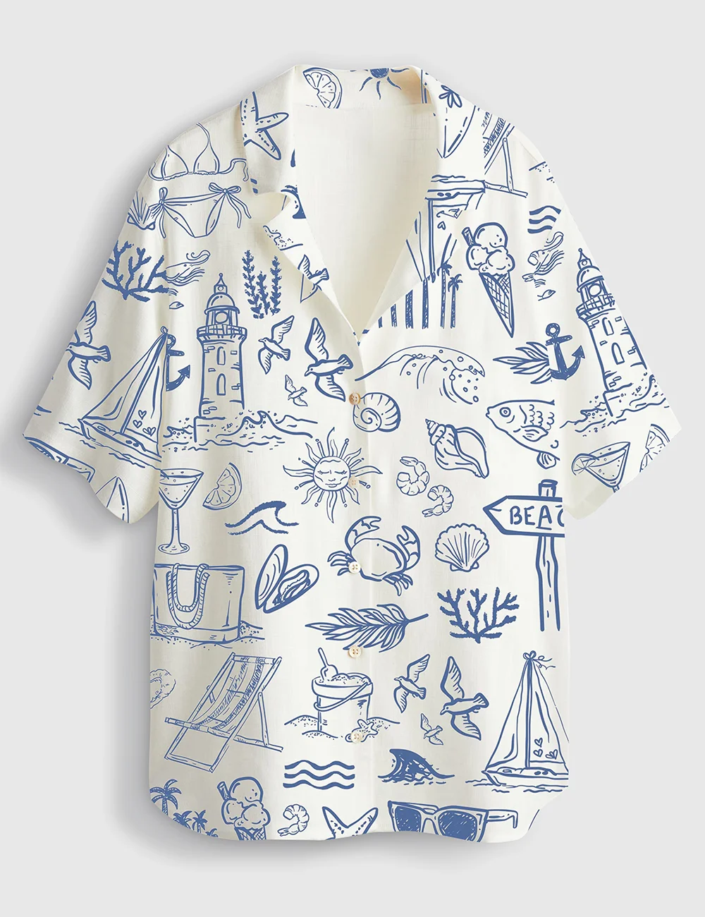Women’s Coastal Whimsical Style Summer Beach Short Sleeve Linen Blend Hawaiian Shirt