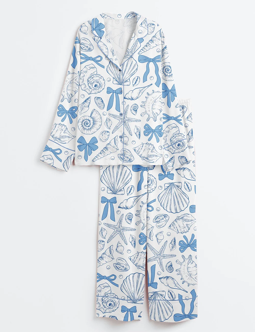 Women’s Coquette Seashell Beach Retro Coastal Girls Trip Summer Vibes Print Long Sleeve Satin Pajama Set
