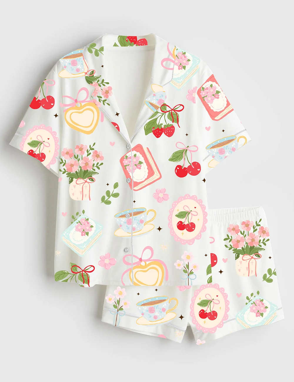 Women’s Cottagecore Tea And Berry Floral Books Cherries And Spring Elements Botanical Floral Farm Book And Coffee Flower Short Sleeve Satin Pajama Set