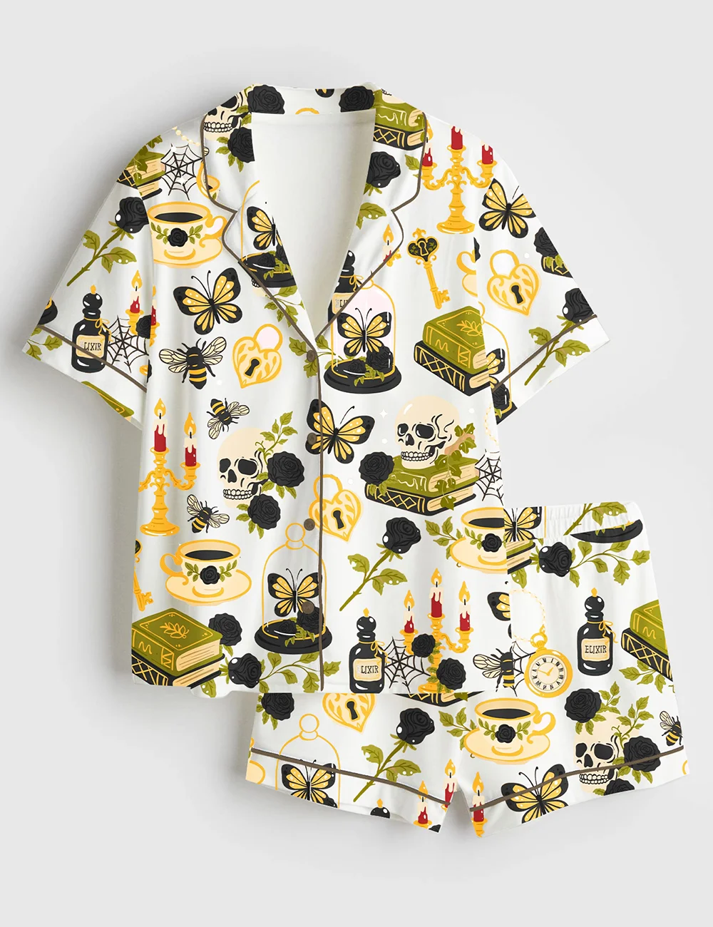 Women’s Dark Academia Halloween Skull Red Rose Gothic Witchy Spooky Cozy Aesthetic Print Short Sleeve Satin Pajama Set