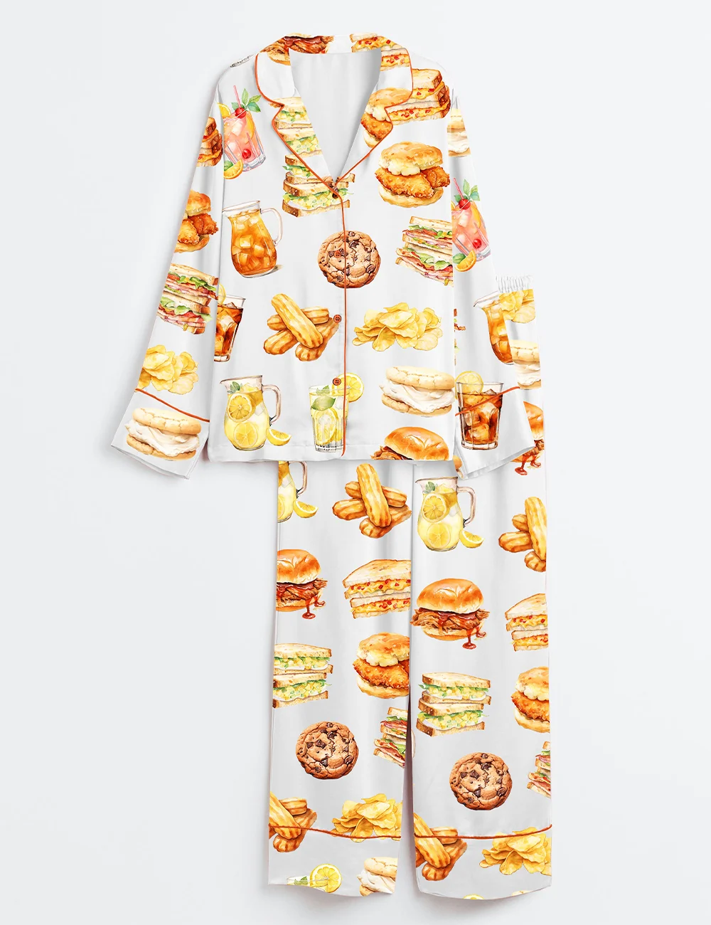 Women’s Fast Food Cheese Hamburger Cocktails Cookie Tasty Food Print Long Sleeve Satin Pajama Set