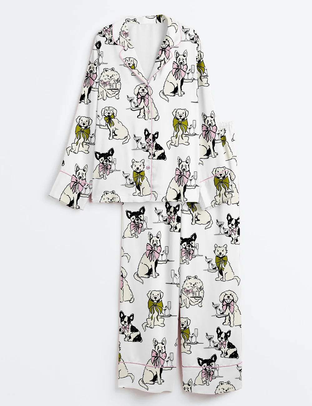 Women’s Festival Martini Drinks Clip Hand Drawn Martini Glass With Bartender Dog Print Long Sleeve Satin Pajama Set