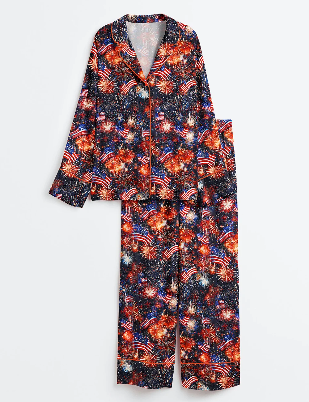 Women’s Fourth Of July Fireworks Red White Blue USA Flag America Long Sleeve Satin Pajama Set