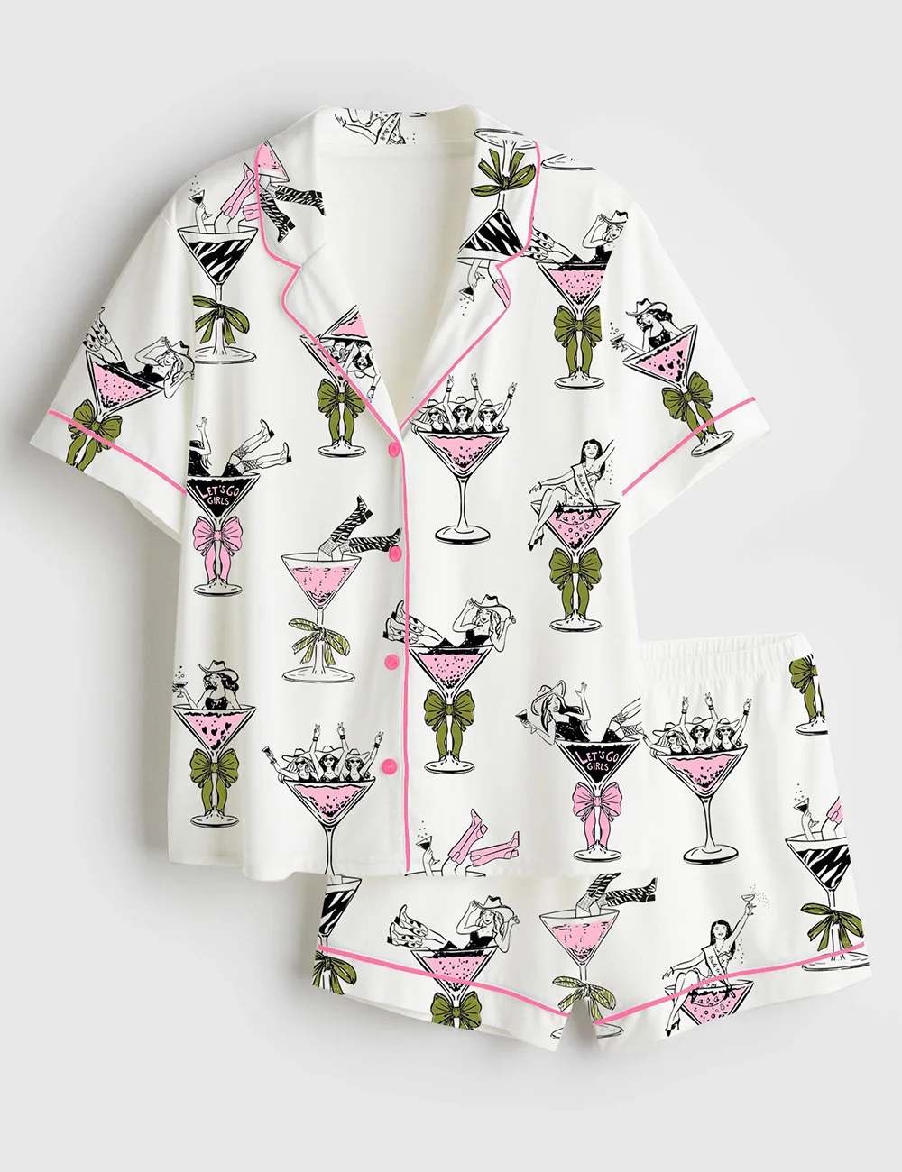 Women’s Girls In Martini Glass Hand Drawn Martini Drinks And Cheering Western Girls Print Short Sleeve Satin Pajama Set