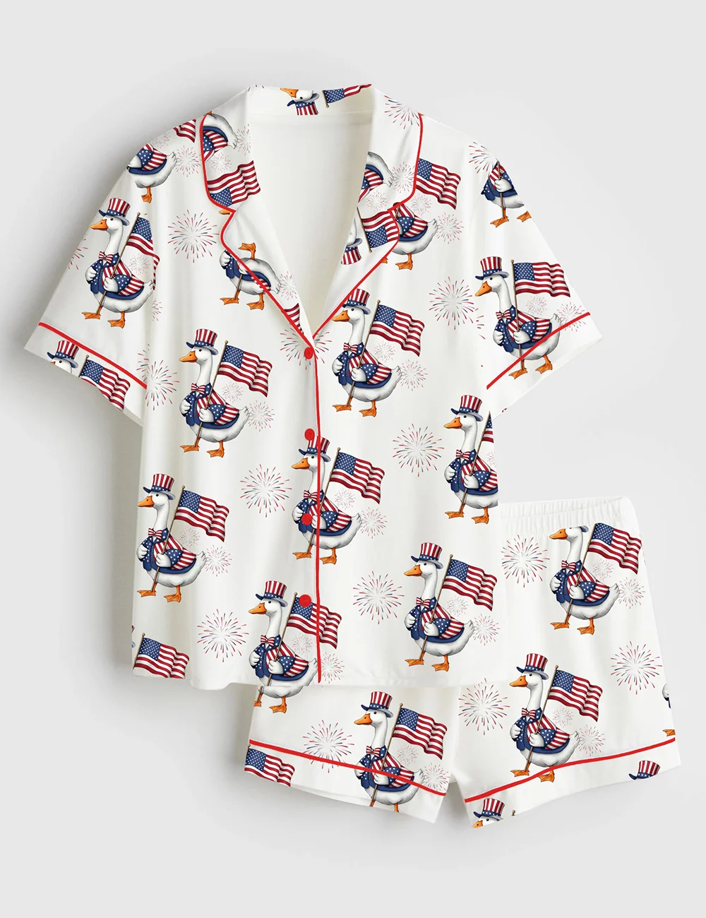 Women’s Goose Fourth Of July Silly Goose Red White Blue USA Coquette America Short Sleeve Satin Pajama Set