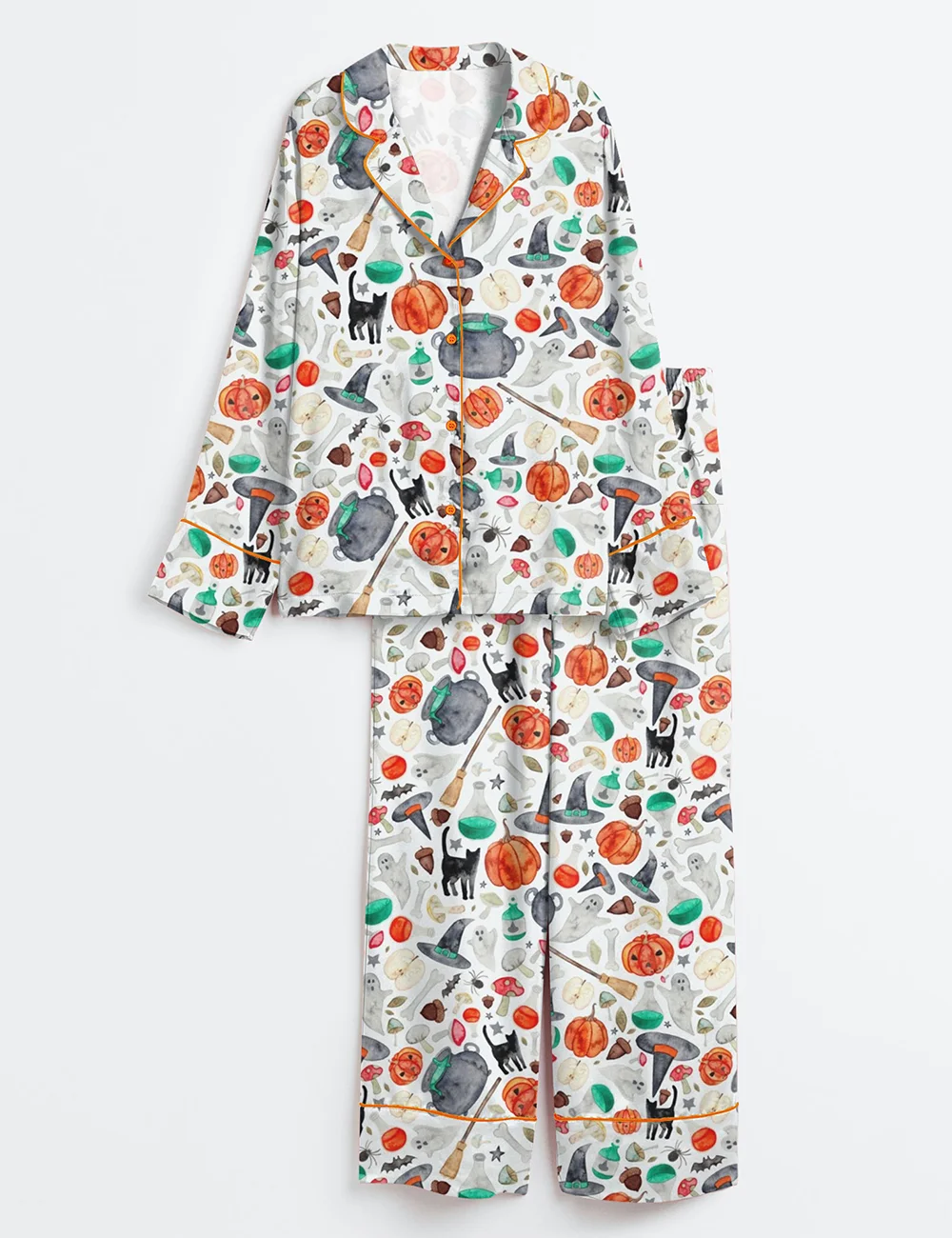 Women’s Halloween Autumn Ghost Pumpkin Cat Broom Long Sleeve Satin Pajama Set