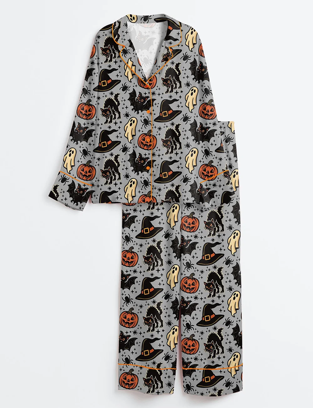 Women’s Halloween Spooky Ghosts Bats Cats Pumpkins Witch Long Sleeve Satin Pajama Set