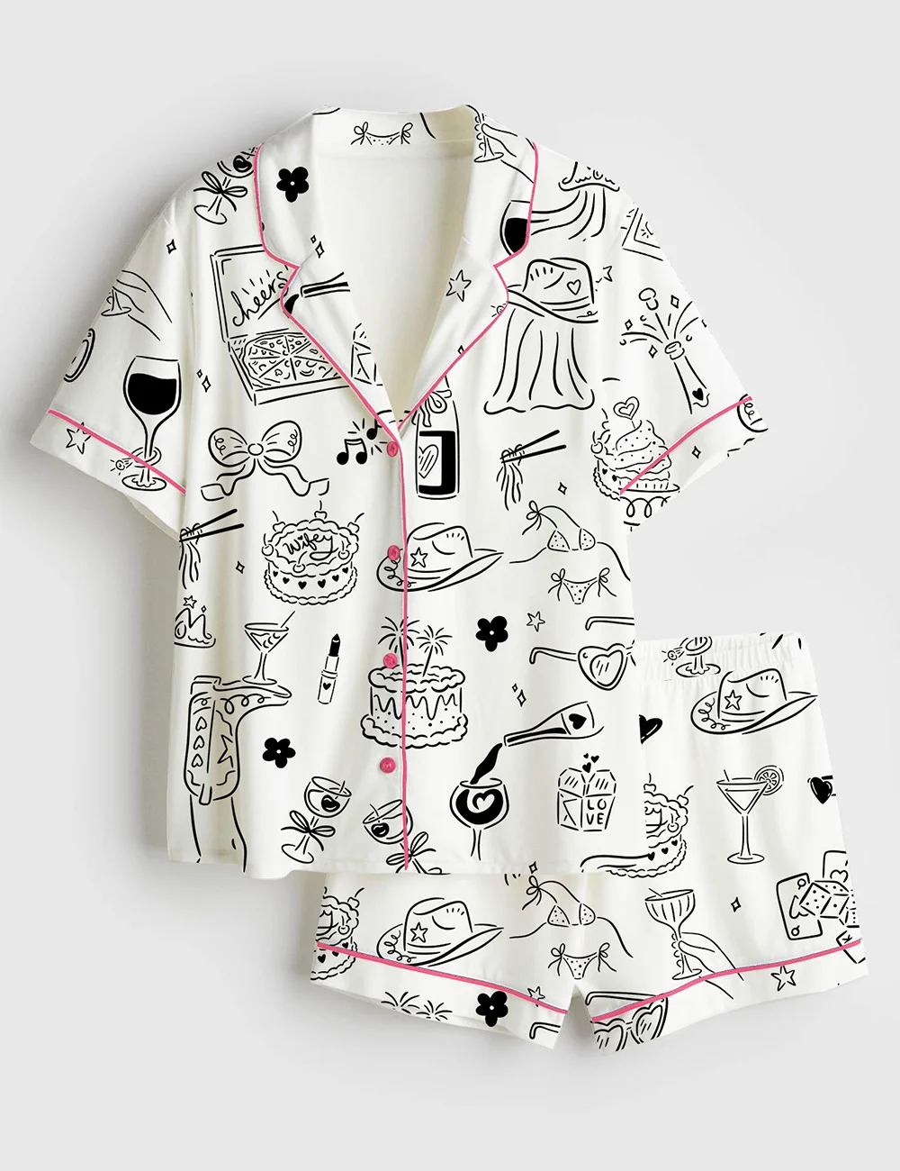Women’s Hand Drawn Bachelorette Whimsical Girls Night Bach Party Print Short Sleeve Satin Pajama Set