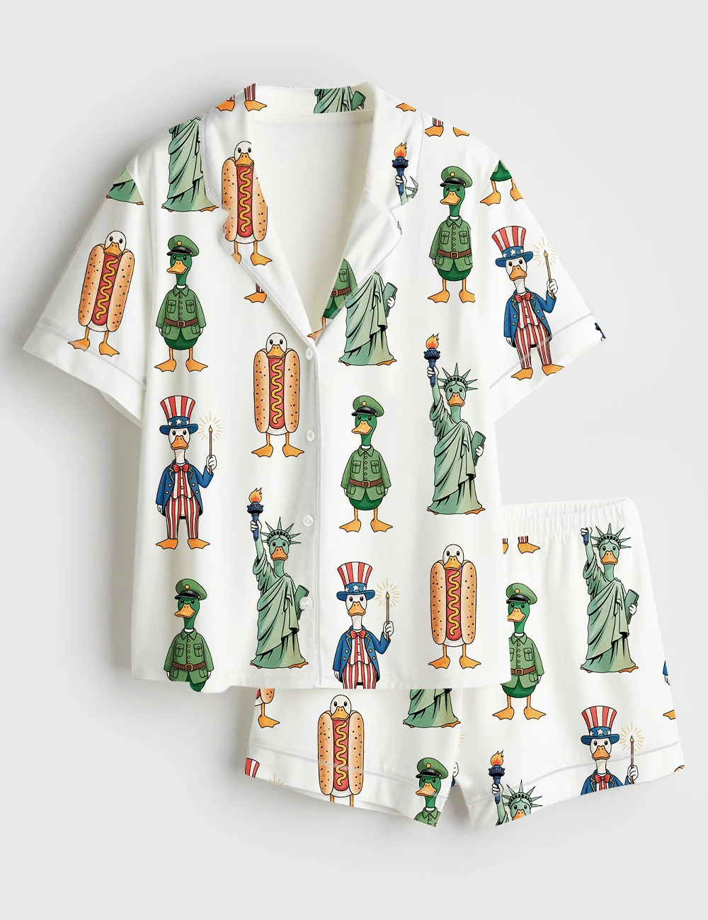 Women’s Patriotic Goose 4th Of July Silly Goose USA Goose Independence Day Patriotic Print Short Sleeve Satin Pajama Set