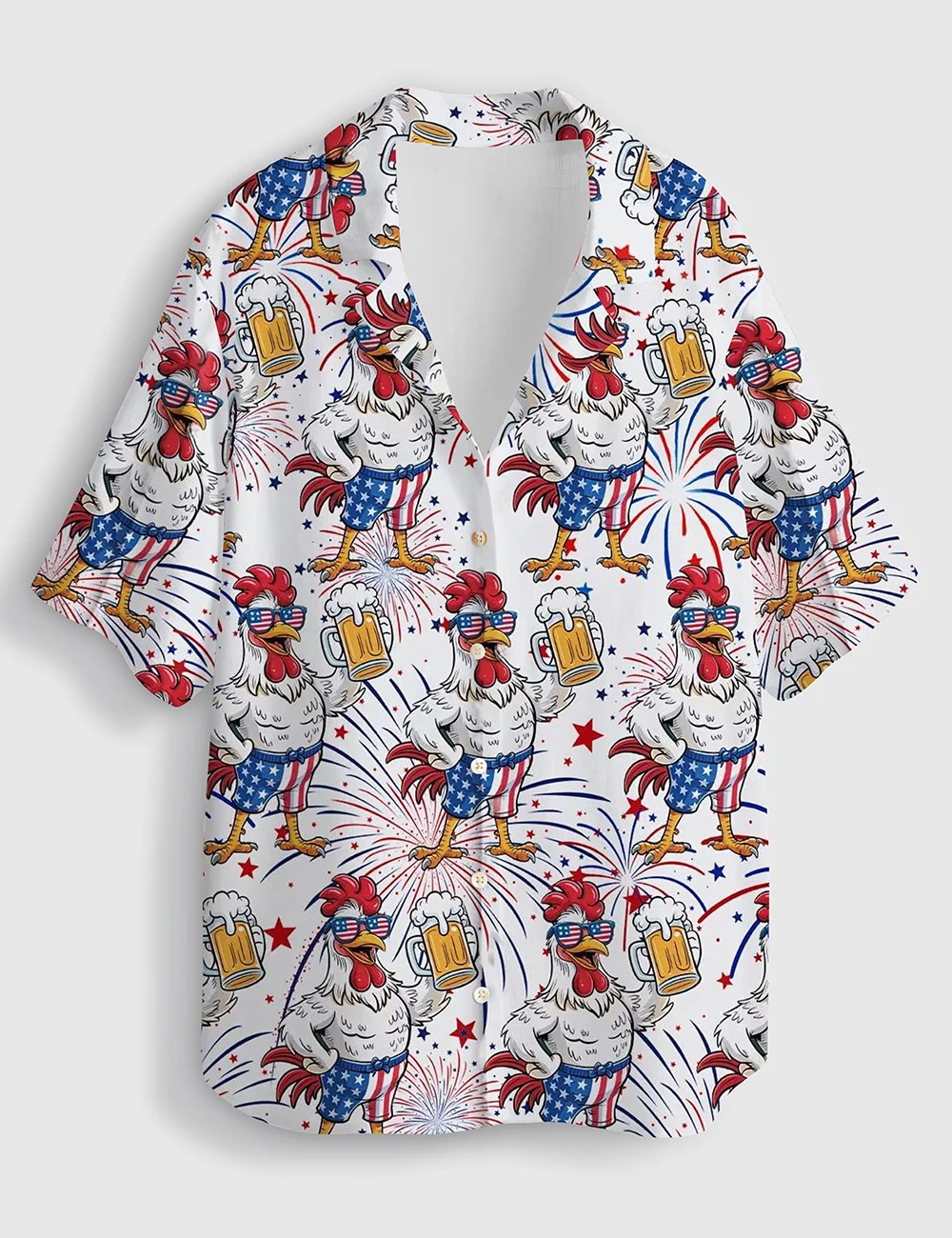 Women’s Patriotic Rooster With Beer 4th Of July Short Sleeve Linen Blend Hawaiian Shirt