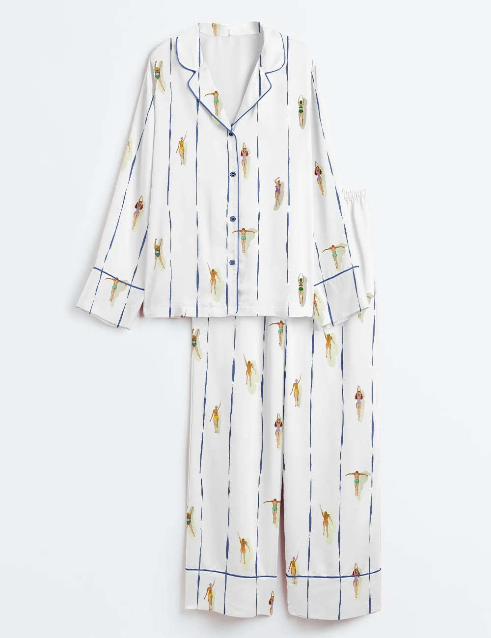 Women’s People Swimming In Pool Summer Minimalist Tiny Swimmers Print Long Sleeve Satin Pajama Set