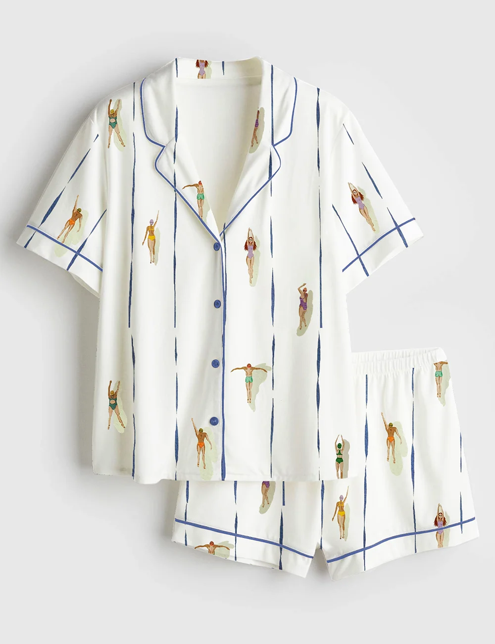 Women’s People Swimming In Pool Summer Minimalist Tiny Swimmers Print Short Sleeve Satin Pajama Set