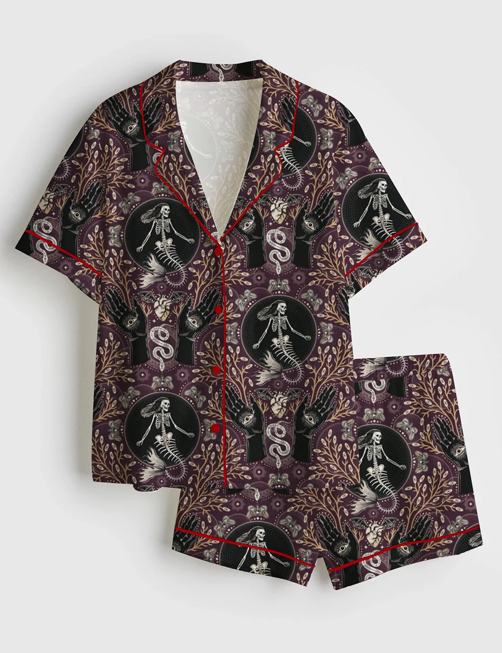 Women’s Phantasmagoria Mermaid Skeleton Hands Eyes Snake Scary Plants And Moths Halloween Short Sleeve Satin Pajama Set