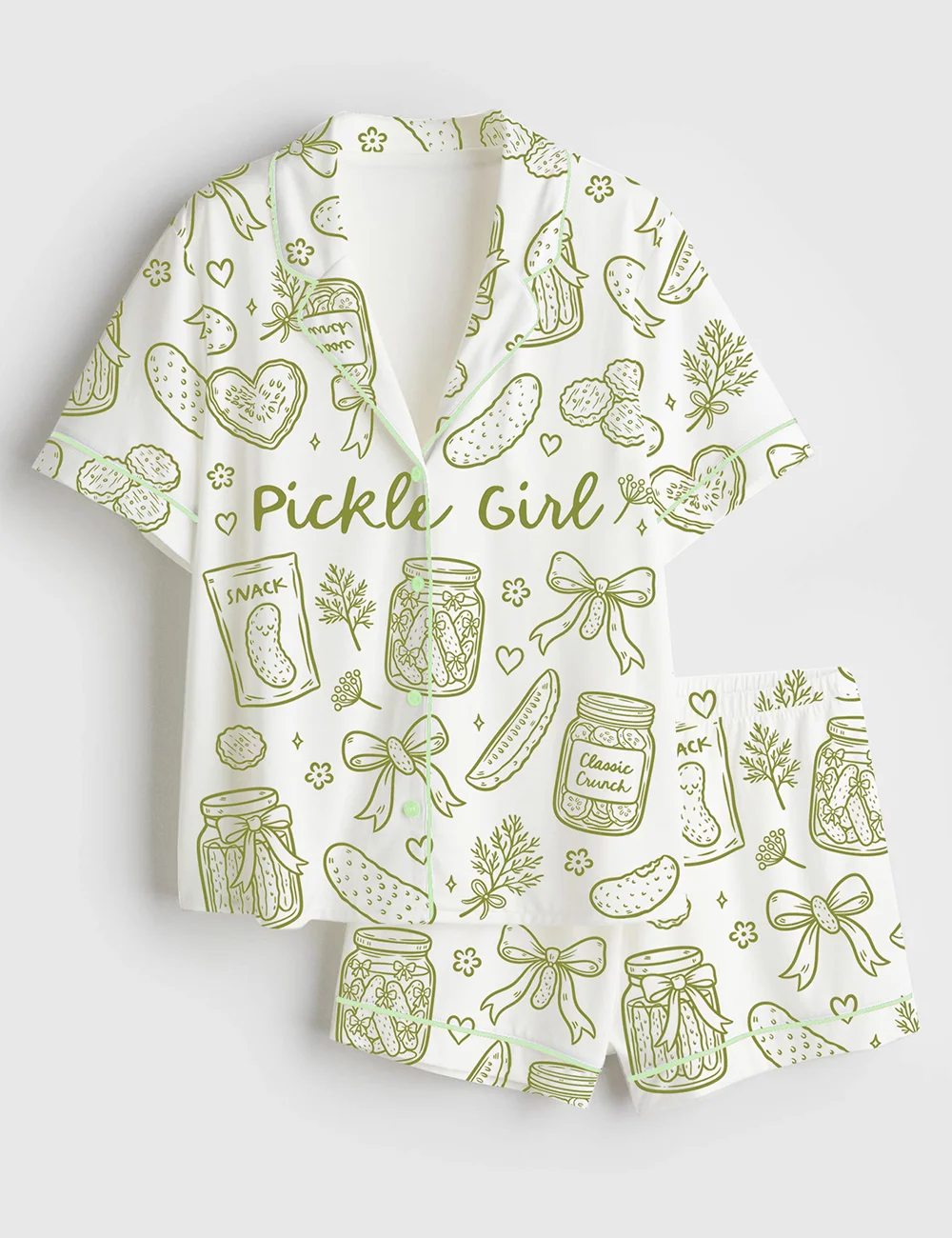 Women’s Pickle Lover Hand Drawn Coquette Pickle Jars Pickle Girls Print Short Sleeve Satin Pajama Set