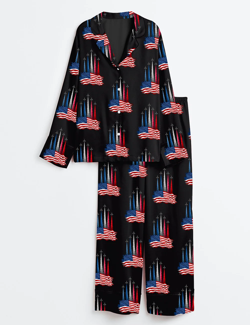 Women’s Realistic Jet Planes Patriotic 4th Of July Shirt Bold American Flag Art Print Long Sleeve Satin Pajama Set