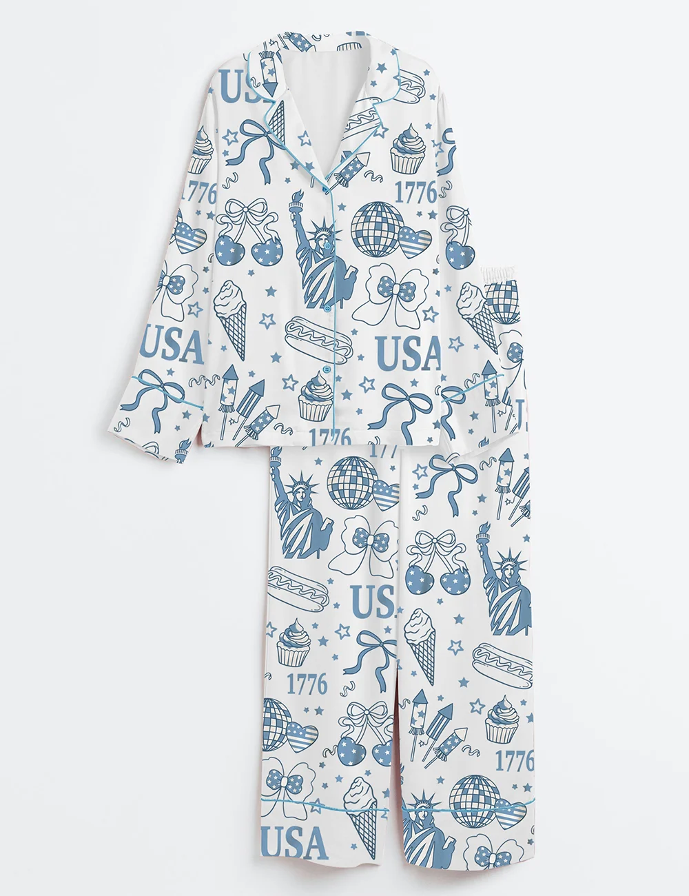 Women’s Retro America Coquette Preppy 4th Of July Girly Memorial Day Print Long Sleeve Satin Pajama Set