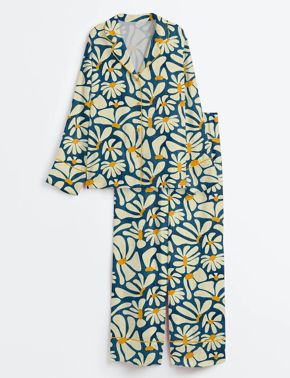 Women’s Retro Daisy Flower Power Blue Floral Vintage Groovy Print Long Sleeve Satin Pajama Set