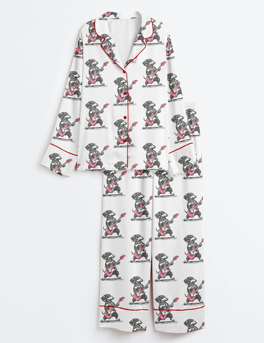 Women’s Rock Doxie Vintage Dachshund Weenie Playing Guitar Funny Wiener Dog Rocker Print Long Sleeve Satin Pajama Set