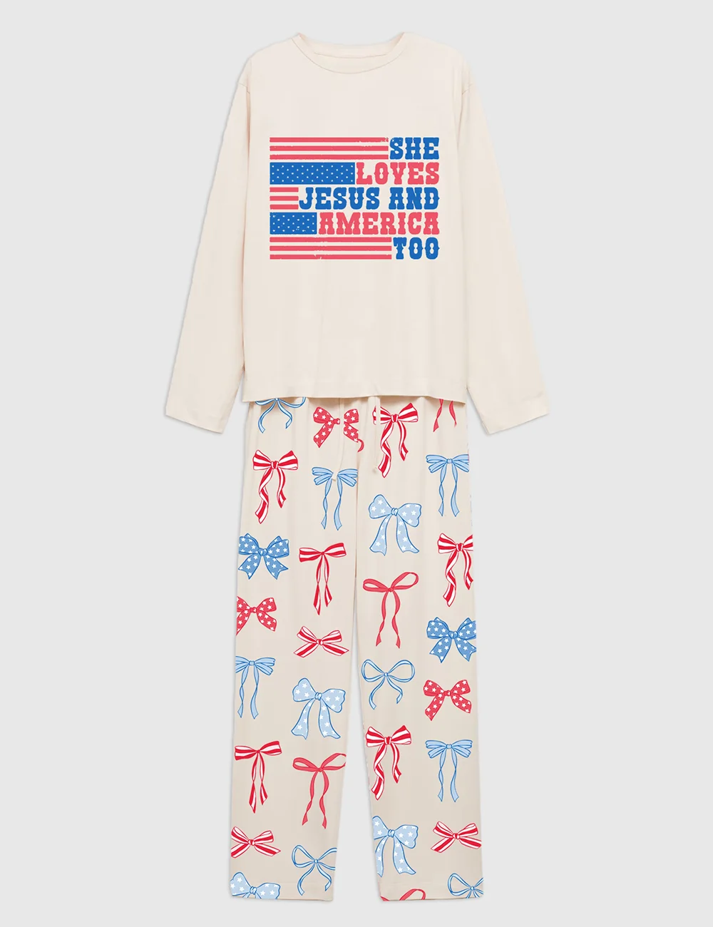 Women’s She Loves Jesus And America Too Patriotic American Bows 4th Of July Long Sleeve Pajama Set