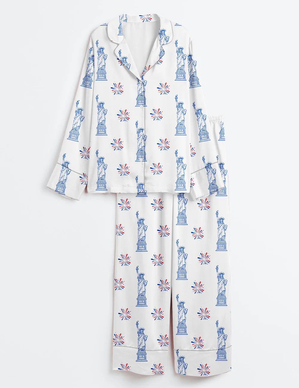 Women’s Statue Of Liberty Patriotic Freedom 4th Of July Pledge Of Allegiance Liberty And Justice For All Print Long Sleeve Satin Pajama Set