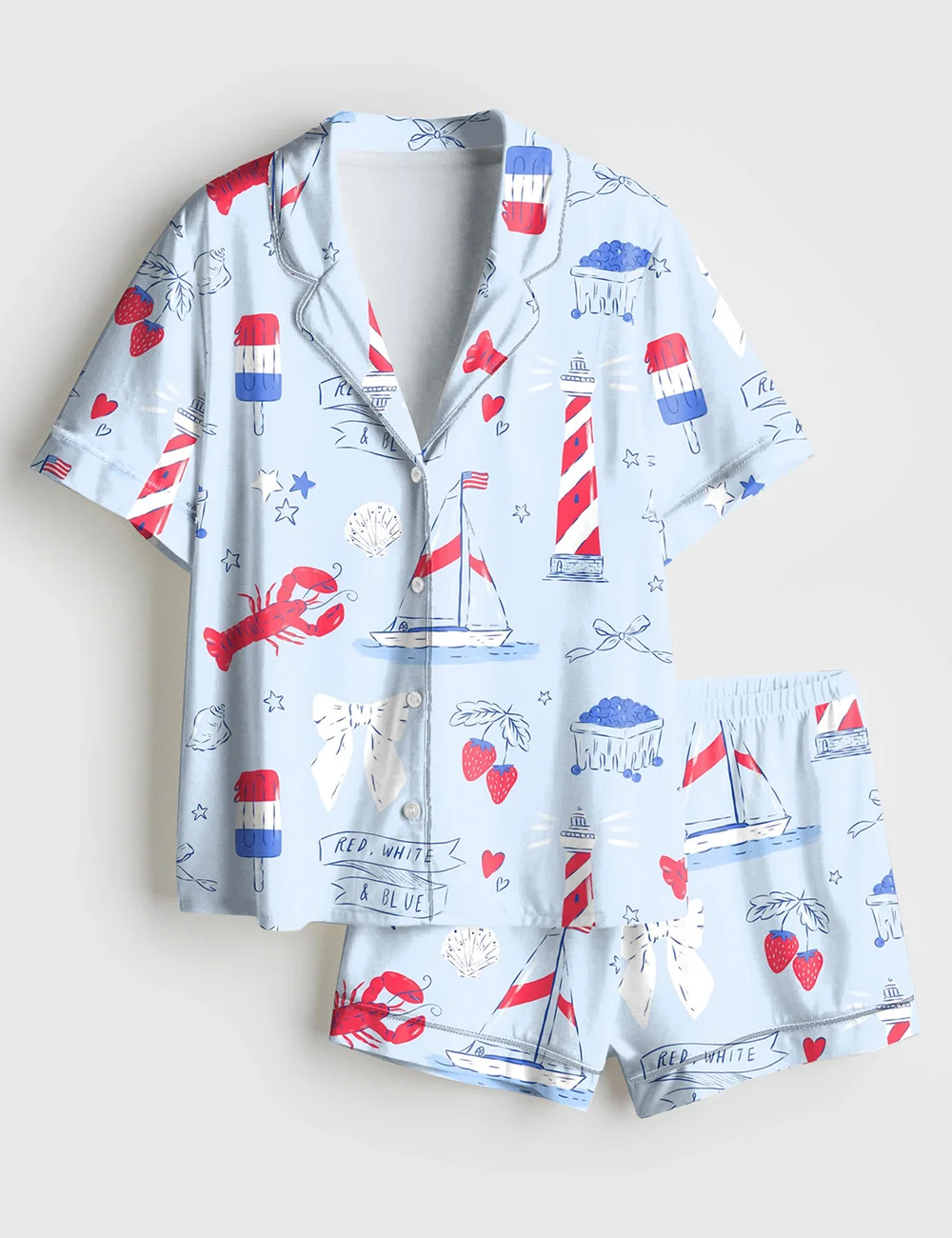 Women’s Summer Americana East Coast Red White And Blue Patriotic 4th Of July Short Sleeve Satin Pajama Set