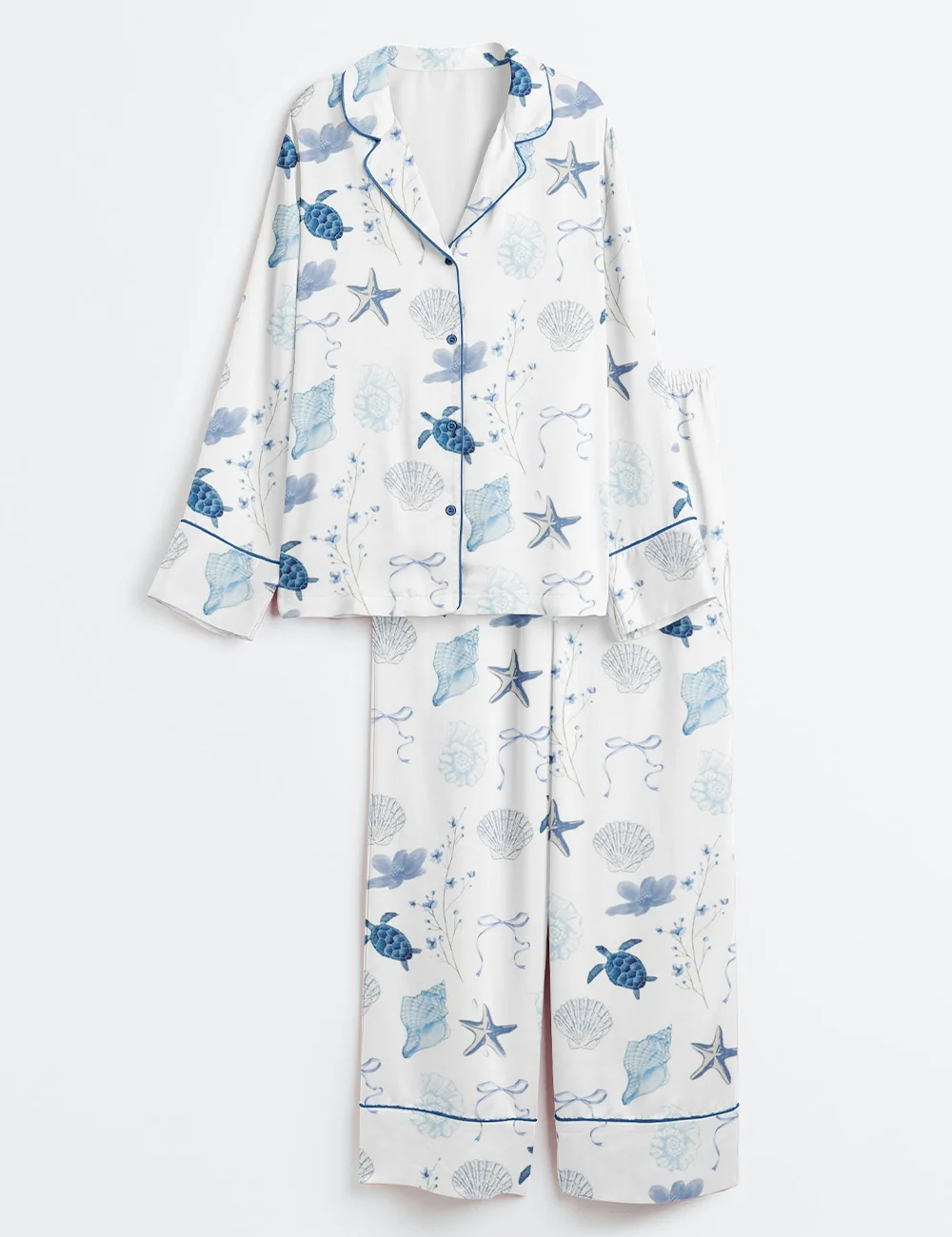 Women’s Summer Beach Ocean Coastal Summer Nautical Turtle Conch Bow Long Sleeve Satin Pajama Set