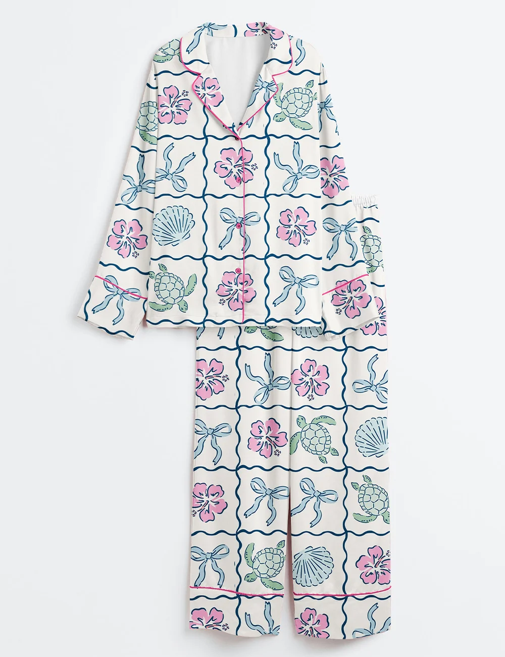 Women’s Summer Turtles Summer Beach Bows In Blue Print Long Sleeve Satin Pajama Set