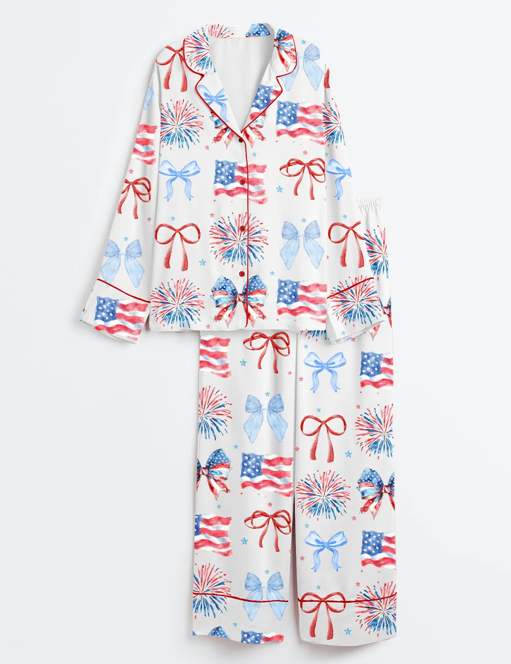 Women’s USA Coquette Bow Retro America 4th Of July Print Long Sleeve Satin Pajama Set