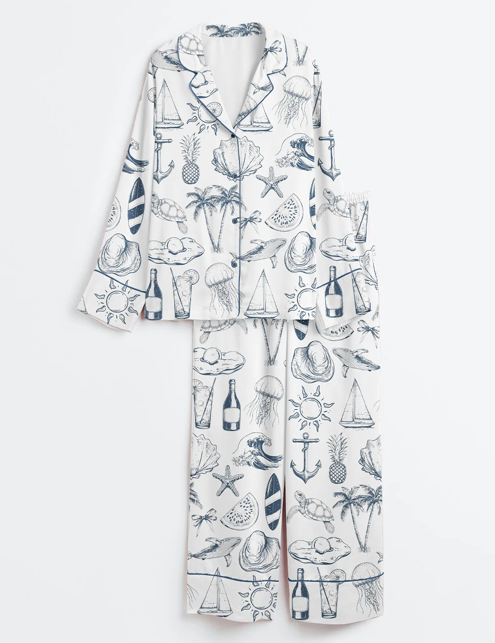 Women’s Vintage Coastal Nautical Hand Drawn Sea Life Retro Summer Beach Print Long Sleeve Satin Pajama Set