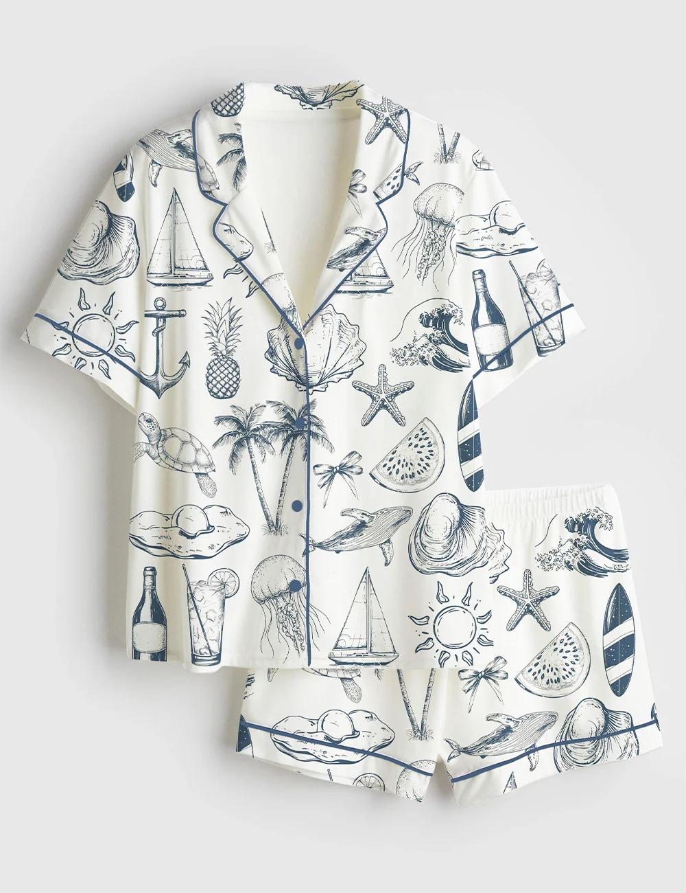 Women’s Vintage Coastal Nautical Hand Drawn Sea Life Retro Summer Beach Print Short Sleeve Satin Pajama Set