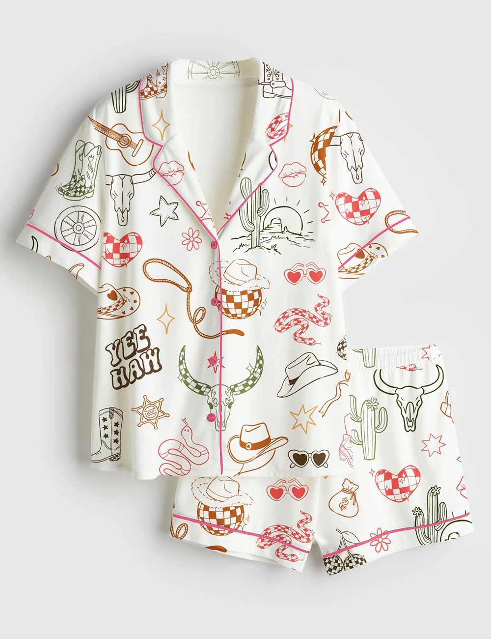 Women’s Western Cowgirl Bachelorette Hand-Drawn Wild West Disco Print Short Sleeve Satin Pajama Set
