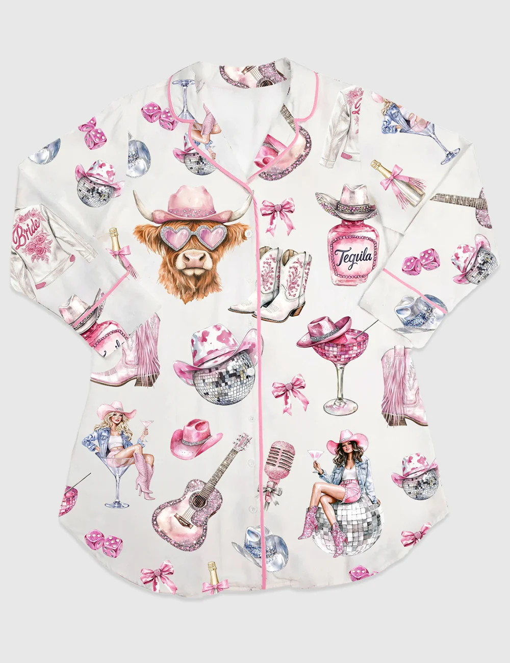 Women’s Western Cowgirl Highland Cow Long Sleeve Satin Sleep Shirt