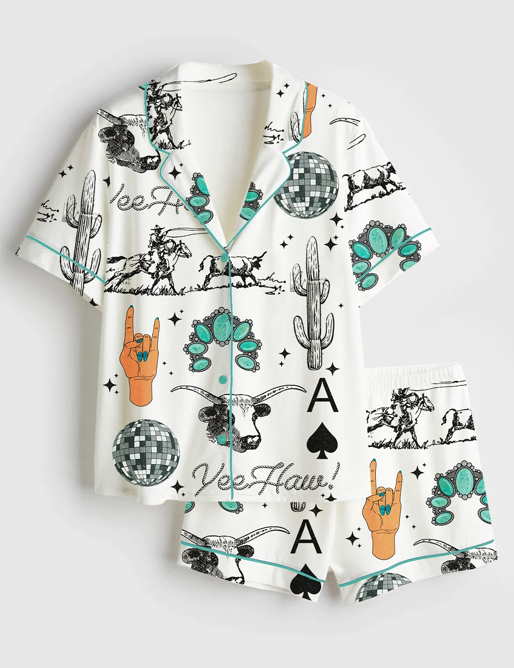 Women’s Western Things Sublimation Cowgirl Spade Rodeo Western Print Short Sleeve Satin Pajama Set