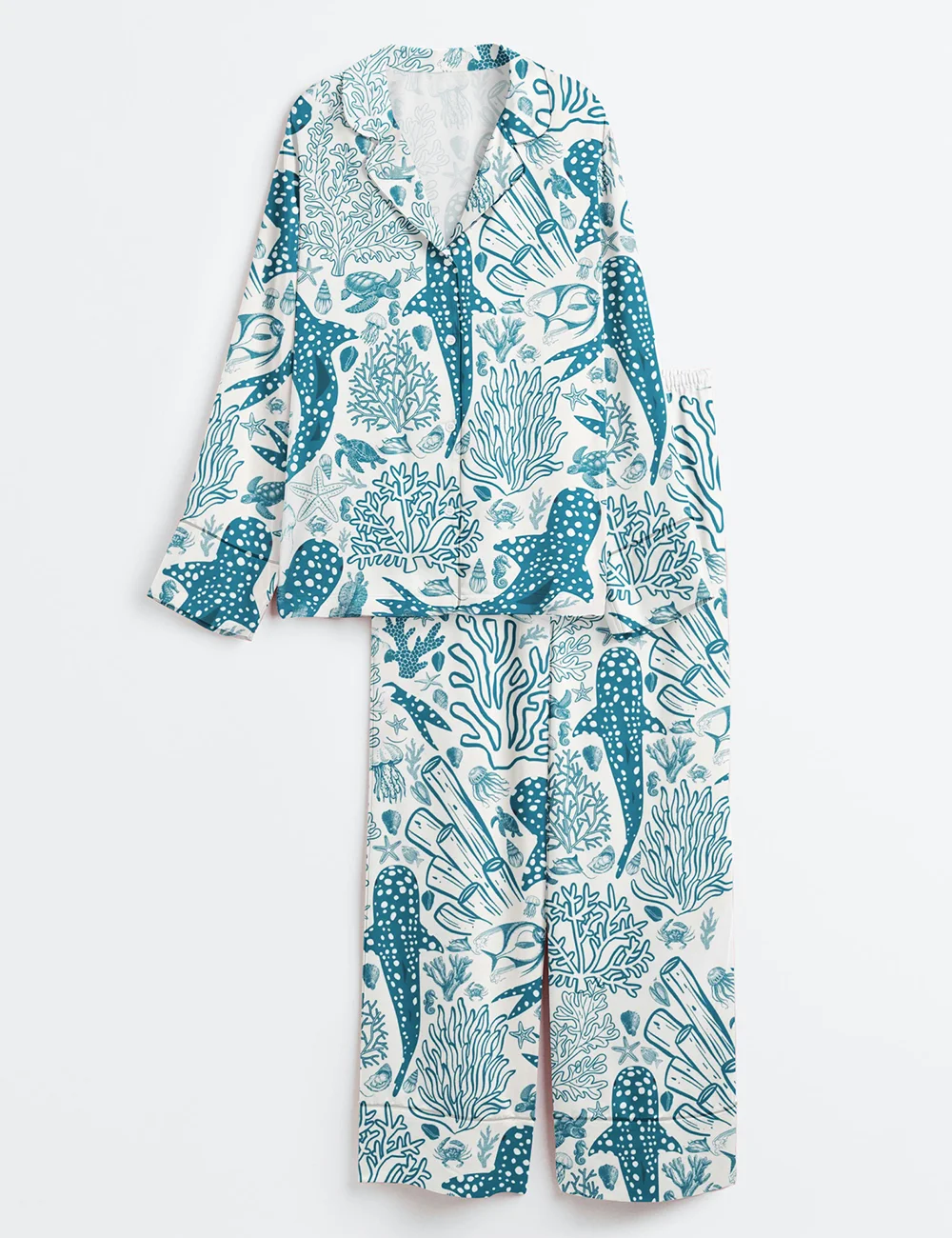 Women’s Whale Shark Coral Reef Ocean Coastal Marine Summer Beach Vibes Print Long Sleeve Satin Pajama Set