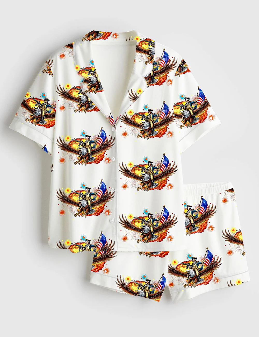 Women’s Wtf Is A Kilometer Eagle Funny 4th Of July Founding Father USA Independence Day Print Short Sleeve Satin Pajama Set